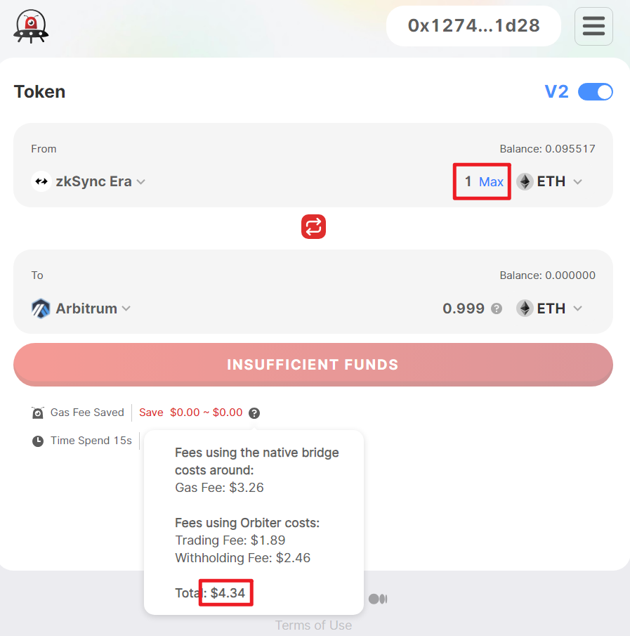 当我们试图把跨链金额提高到 1ETH 时,跨链手续费立刻水涨船高,来到了 4.43U。