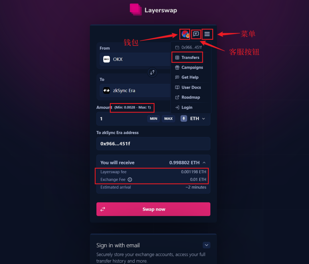 打开 Layerswap 的官网,因为它支持交易所直接跨链,这里我们尝试从 OKX 跨链 ETH 到 zkSync Era。
