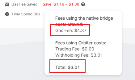 如图所示,界面非常简洁,直接选择好对应的链、代币,并填入数量即可。底部会显示帮你节省了多少 GAS 费以及时间,如果你想看到实际费用,将鼠标指针放在问号上面就会显示官方跨链桥的费用,以及使用 Orbiter 的费用。