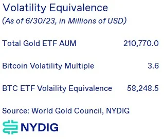 从美元的绝对数量上看,这些数字令人震惊——黄金基金的投资超过 2100 亿美元,而比特币基金的投资只有 288 亿美元。比特币的波动性约为黄金的 3.6 倍,这意味着在波动性等价的基础上,投资者需要的比特币数量将比黄金少 3.6 倍,以获取同样多的风险暴露。尽管如此,这仍会导致比特币 ETF 的需求增加近 300 亿美元。