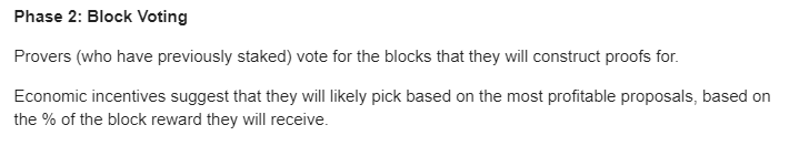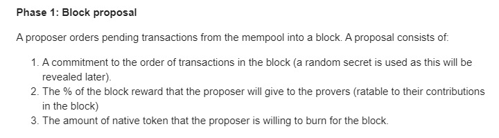 Block Proposal(BP) 阶段中任何人都可以收集交易,并广播自己的BP内容。BP内容会包含三个部分: txs order hash, prover reward percentage, burn token amount