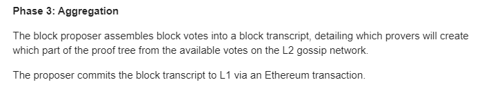 Aggregation聚合:Proposer在L2 p2p网络中收集Prover们针对BP的投票,将其聚合并放进BP中,提交到L1上(每个BP一般只包含与自己有关的投票记录)。