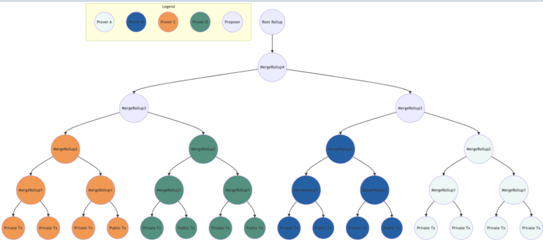 假设Aztec的区块包含2^13=16384的交易数量,并且有2048个prover,那么每个prover构造2^3=8笔交易组成的sub proof tree. 然后prover把自己构造的sub proof tree广播到L2 p2p网络中。proposer接收之后,会把所有的sub proof tree聚合成一个block proof。