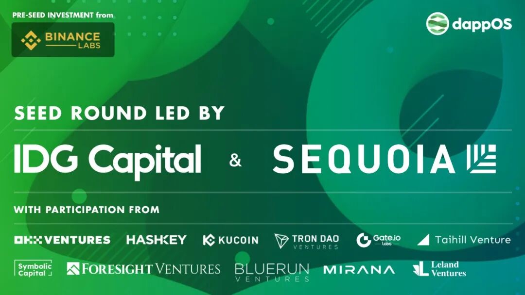 上周,dappOS 再宣布重磅消息,以 5000 万美元的估值完成种子轮融资,IDG Capital 和红杉中国领投,OKX Ventures、HashKey Capital、KuCoin Ventures、TronDao、Gate Labs、Taihill Ventures、Symbolic Capital、Foresight Ventures、BlueRun Ventures、Mirana Ventures、Leland Ventures 等参投。