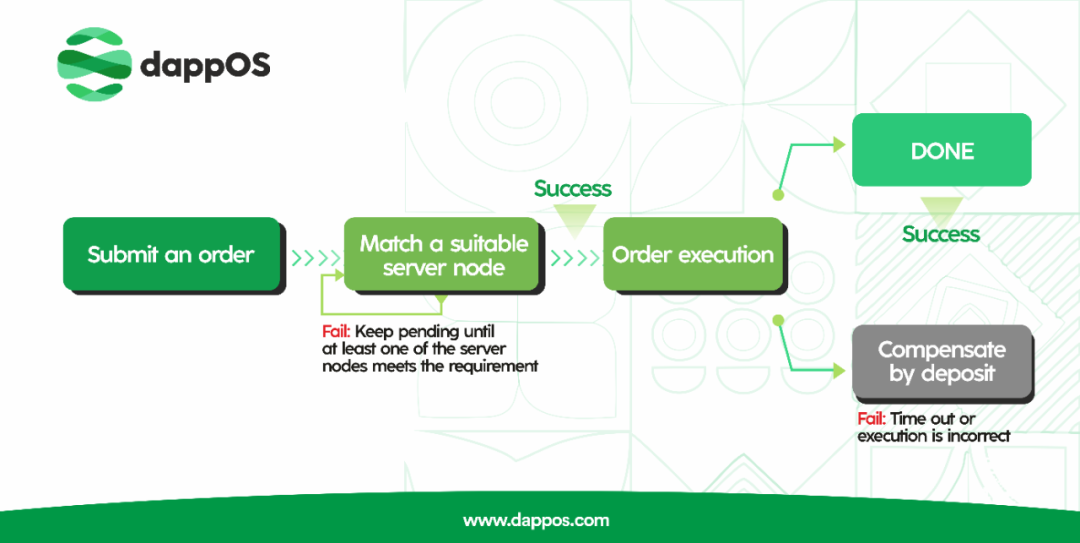 dappOS Network 中的超级节点会将订单委托给一个服务节点,后者要么很好的执行,要么被前者扣除保证金以赔偿用户的损失。