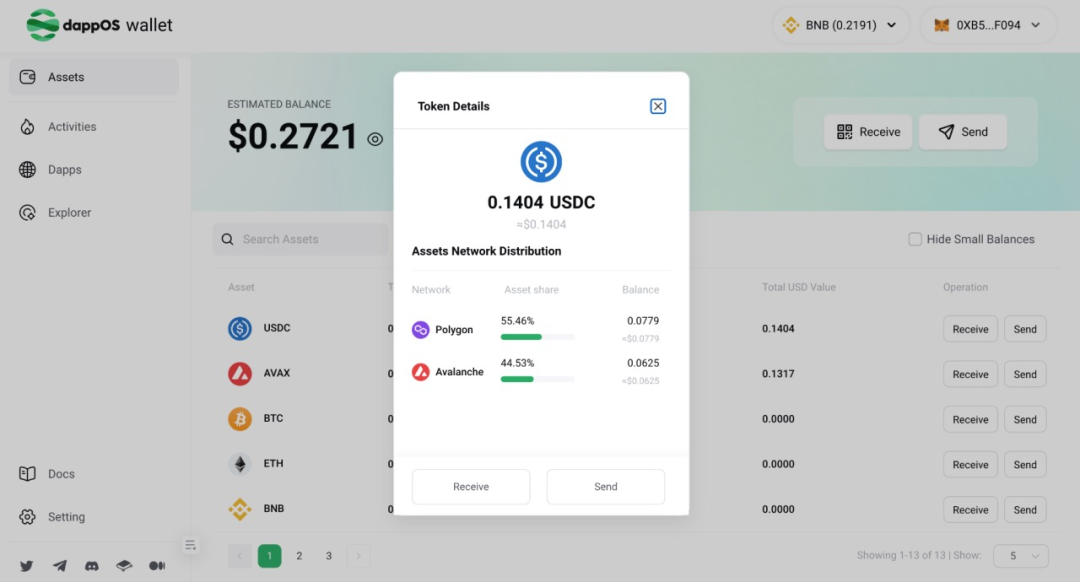 例如,小明在 dappOS 统一账户中的总余额是 100 USDC,其中 50 USDC 在以太坊链上,50 USDC 在 BNB Chain 上,小明仅需签名一次确认交易即可在 Arbitrum 上的 GMX 或者 Avalanche 的 Benqi 上使用这 100 USDC 的总余额,而且还不需要考虑 Gas 支付问题。