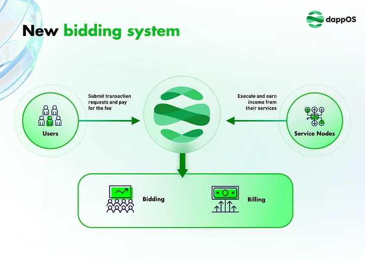 dappOS V2 还将推出全新的节点竞价系统,允许用户在交易时能够看到服务节点列表,并能够显示所有的服务节点完成该交易所需要的费用与时间,用户能够对不同的服务节点进行自主选择,以提升交易效率降低交易成本。
