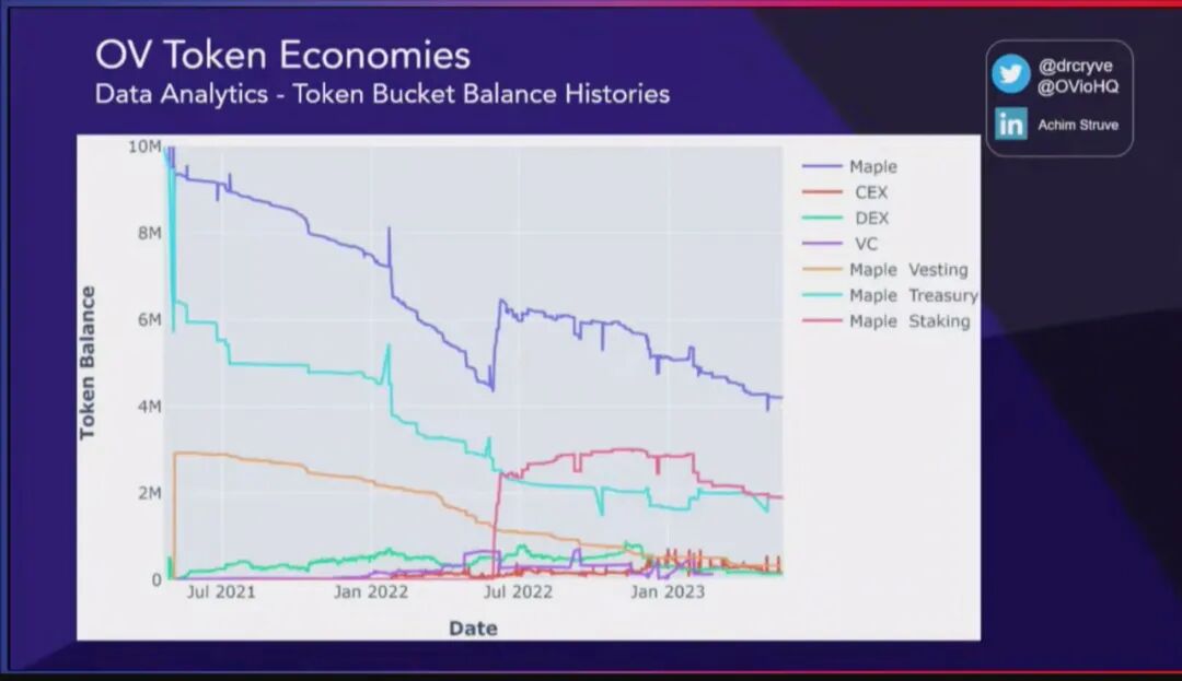 再举个有关于代币桶的历史余额。以 Maple Finance 为例,可以查看其原生代币的情况,并追踪整个生态系统中的所有交易,将它们分类到特定的 “代币桶” 中,例如与 Maple 相关的地址、中心化交易所相关的地址以及去中心化交易所地址等。通过这种方式,我们可以查看每个利益相关者的余额,并观察整个生态系统中正在发生的情况。