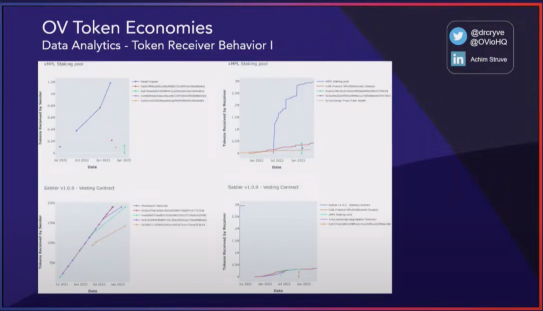 在代币生态系统中,观察特定地址的行为可以提供关于代币流动性的重要信息。举例来说,当代币从质押合约中发送到特定地址时,可以了解接收者对这些代币的处理方式。他们是选择重新投资这些代币,将其再次发送回质押合约,还是出售掉,或者在其他地方进行部署?这些都是通过分析来理解每个利益相关者行为的关键信息,而我们可以将这些数据反馈到我们的模型中,有助于调整模型。