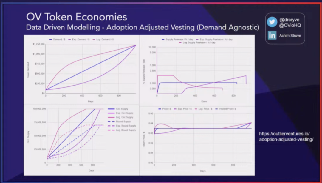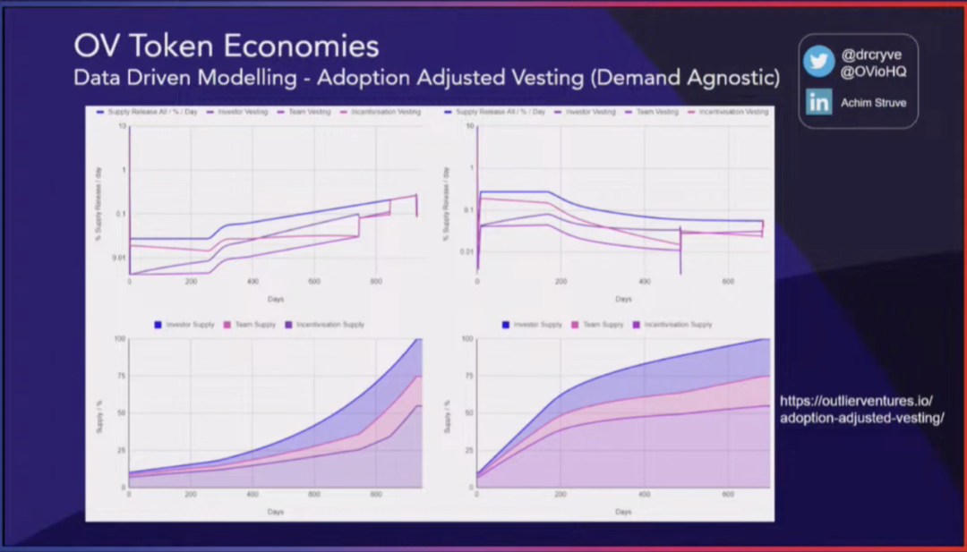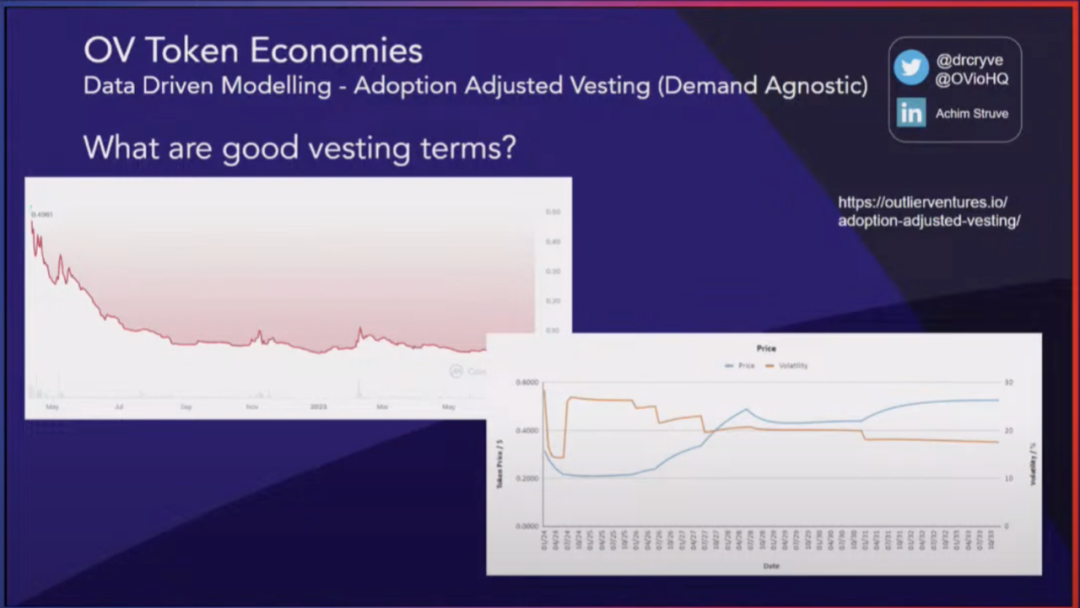 另一个主题是对归属计划的新思考方式。有时人们认为只需要非常长的归属计划,但这并不总是好的,因为这意味着在初始流通中的供应非常低,从而引发市场上的投机和潜在炒作行为。因此,我们提出了引入一种采用调整的代币归属机制,不受市场需求影响。换句话说,预测生态系统的需求并不是必要的,因为归属释放将由控制器根据事先定义的某些关键绩效指标来进行控制。这些关键绩效指标可以包括 TVL、交易量、用户采用率、业务盈利能力等等。在这个例子中,简单地使用了代币的价格。