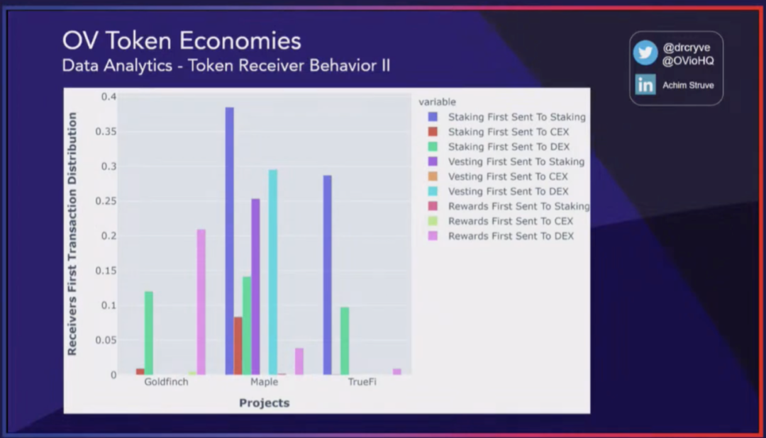 这个模型不仅可以分析个别地址的代币接收者行为,还可以针对代表性的汇总利益相关者群体进行分析。举例来说,我们可以对多个代币项目如 Maple、Goldfinch 和TrueFi 等进行分析,发现大约 38% 的代币在通过质押合约收到后,第一笔交易就被发送回质押合约。相比之下,中心化交易所的比例约为 8%,而去中心化交易所的比例约为 14%。通过在 QTM 上回顾某个时间点的代币桶分配情况,可以了解代币的流通供应量情况。这些数值可以应用到我们的参数中,从而初步了解生态系统的行为。