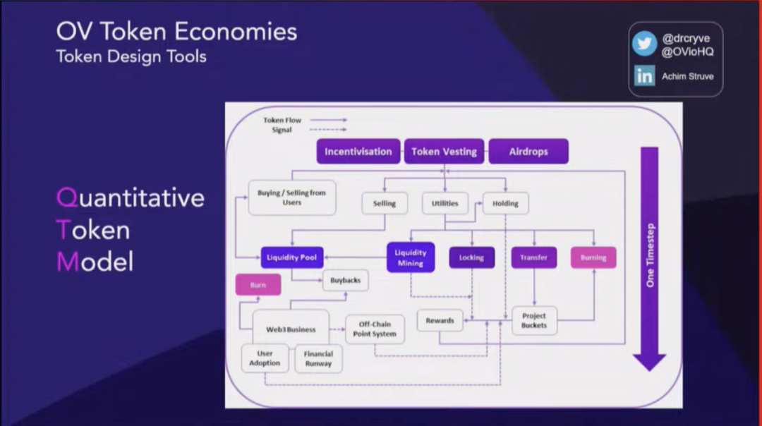 在代币生态系统中,有多种工具可帮助我们理解和设计该系统。在以上“代币设计工具图”的左端,有电子表格模型和一些定性工具,例如问题陈述、利益相关者问题陈述、利益相关者映射以及特定的价值流等。我们甚至可以利用 AI 驱动的推理,比如用机器学习模型来起草第一个代币设计。而在图的中间部分,例如 QTM(量化代币模型),虽然它也是一个电子表格模型,但它覆盖了多个不同的领域,不仅限于DeFi。这种广泛的覆盖面可能会导致精确度的损失,但它确实可以帮助初创企业获得第一手的洞察力,以及对其代币生态系统的初步理解。