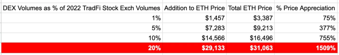模型的输入是 DEX 交易 AI DAO Token 占传统证券交易量的百分比。由于市场是向前看的,我只是估计未来 5 年该百分比可能会达到的水平,而不是追求绝对准确。我希望能够把握方向并从 “不可能发生” 转向 “可能发生” 的市场情绪中获利。以下是输出结果表格:
