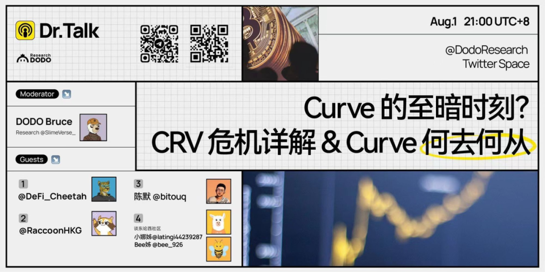 8 月 1 日的 Twitter Space 上 DODO research 邀请到了 DeFi Cheetah,陈默,BujiDAO 小浣熊对 Curve 正在经历的危机作出分析和预测。在讨论的高潮部分 Curve 代表区块先生和 DODO co-founder 雷达也贡献了精彩观点。
