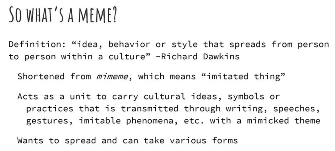 Meme 是世界上最强大的东西。Meme 统治一切、一切都是 Meme 。Meme 不仅仅是 doge、pepe,宗教是一种 Meme 、饮食是 Meme、所有的时尚其实也是 Meme。
