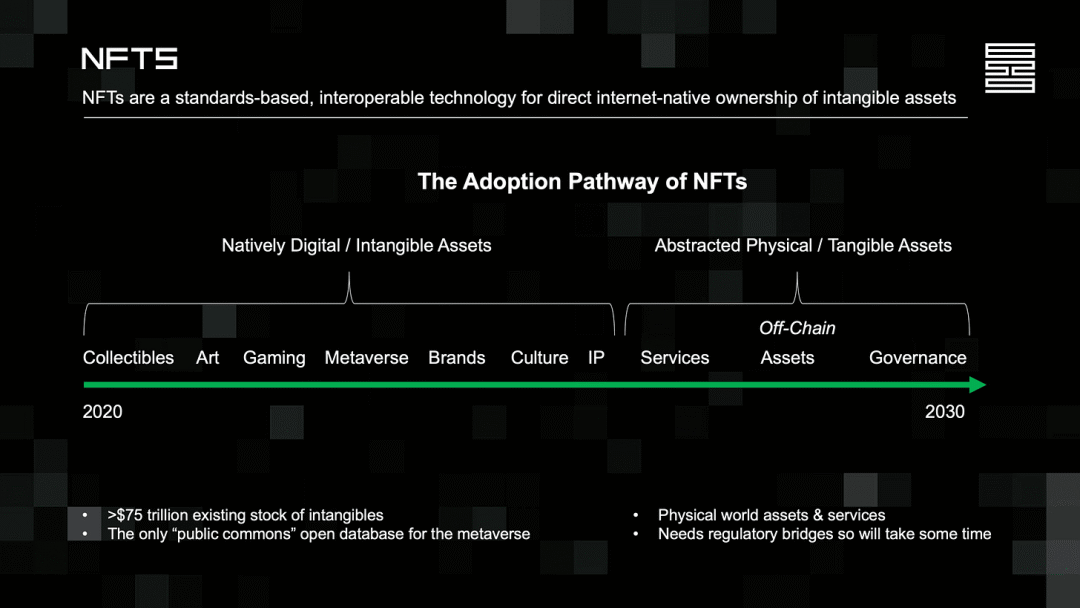 每当谈及 NFT 的可能性和未来时,我喜欢引用 @punk6529 的那张图。我们处于 crypto 的早期。NFT 的大部分仍然是艺术 + 收藏品的阵营,但游戏、元宇宙、品牌、文化和知识产权也都占有一席之地,并且在这些领域正在发生许多令人兴奋的事情。