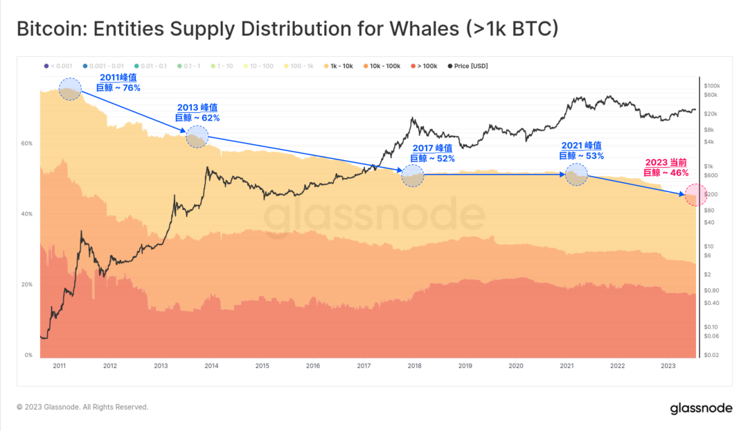 巨鲸实体的总余额也一直在下降。根据下图,今年巨鲸实体占总供应量的 46%,低于 2021 年初的 63%。