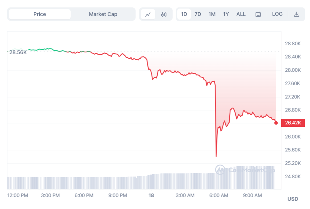 或许受到此消息影响,今晨比特币价格暴跌8%以上,一度跌至25409美元,Bitfinex 上的比特币价格甚至更低,一度触及 24715 美元的低点,随后回升至 26000 美元上。此次下跌使比特币创下 6 月 20 日以来的最低点。
