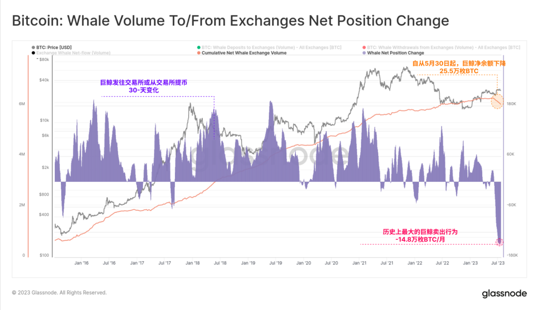 具体来看,自5月30日以来,比特币巨鲸地址持有的总余额已减少了约25.5万枚比特币,这一趋势代表了历史上最大的月度余额下降,达到14.8万枚比特币。