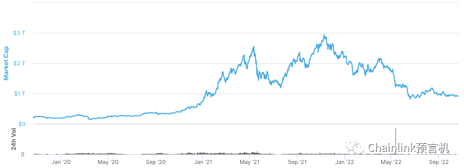 Crypto市值指Web3生态中的通证总价值。这是衡量Web3行业总体财务健康度的指标,可以用来分辨牛熊市。我们可以看一眼Web3行业的市值增长情况。Web3行业市值从2017年初的170亿美元增长至了2021年11月的2.9万亿美元。