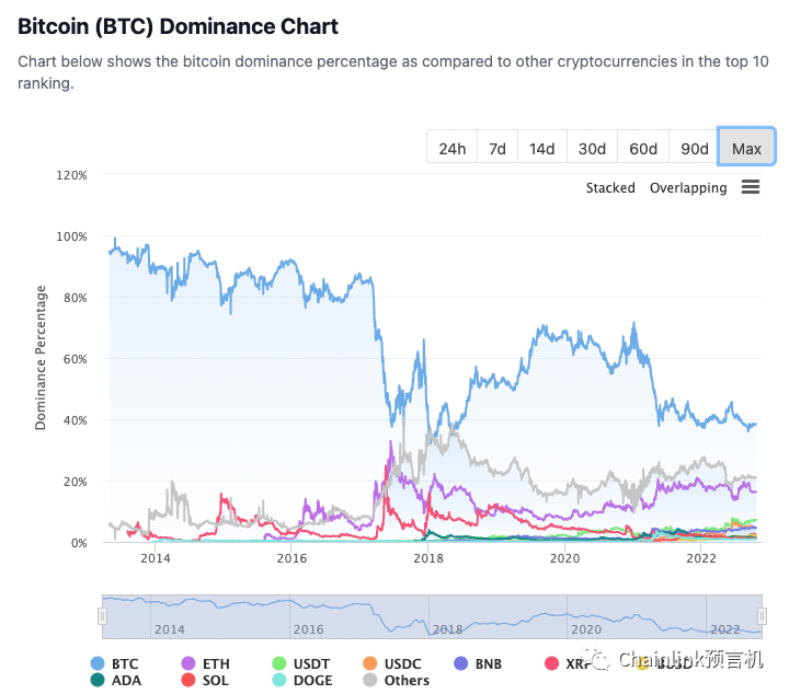 虽然比特币仍然占最大的市场份额,但其主导地位正在下滑