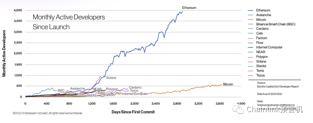 以太坊是第一个智能合约平台,催生出了区块链行业大量早期的创新和发展。以太坊创建了一个开发者社区并推出了丰富的开发工具和资源,以推动生态向前发展。下图中可以发现,Solana的发展趋势与早期以太坊相似。