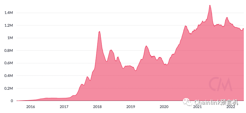 交易量指某一阶段达成的交易数量。以太坊生态的日交易量从2020年初的50万翻倍至了2022年8月的100万。