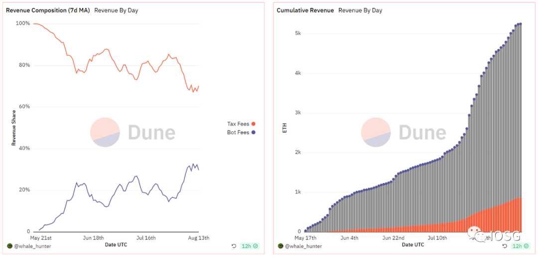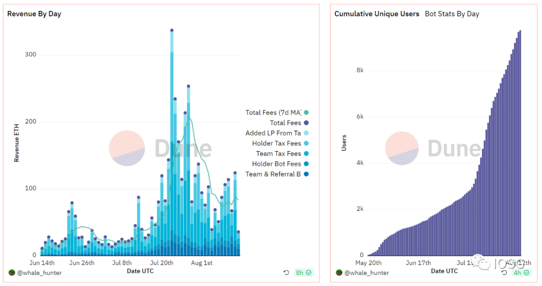 作为自动化交易工具赛道的头部项目,Unibot的营收已经超过了4000ETH,主要来源为工具费用和代币交易税. 代币具有共享收益功能,必须持有10个$UNIBOT代币才有资格。奖励与持有的代币数量成正比。代币持有者将获得工具平台交易费用的40%和UNIBOT代币交易的交易税(总额的1%)。奖励每2小时计算一次,24小时可领取,每隔2小时转移超过200个代币将被没收收入份额。巨大的币价涨幅引起了市场的FOMO情绪和关注热度,带来了新用户的快速增长,整个自动化交易工具赛道也迎来拉升。