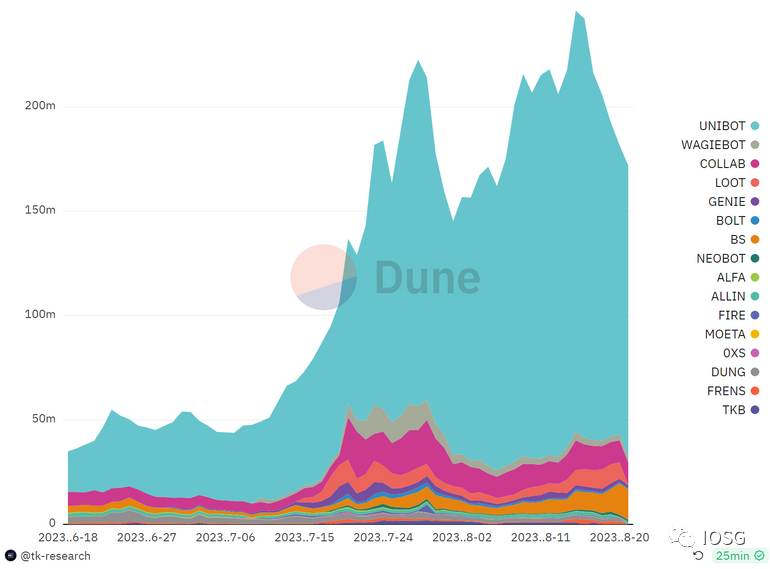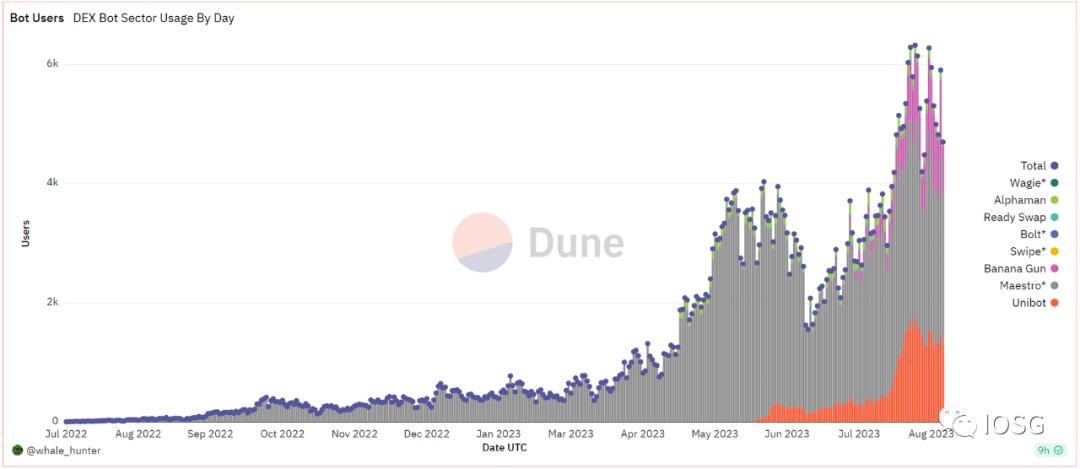 自动化交易工具的用户在近期出现了迅猛增长,链上交易的telegram bot用户数近期每日接近六千,其中大部分用户来自运营时间较久的Maestro和后起之秀Unibot,两者占据了dex telegram bot 80%以上的用户份额。