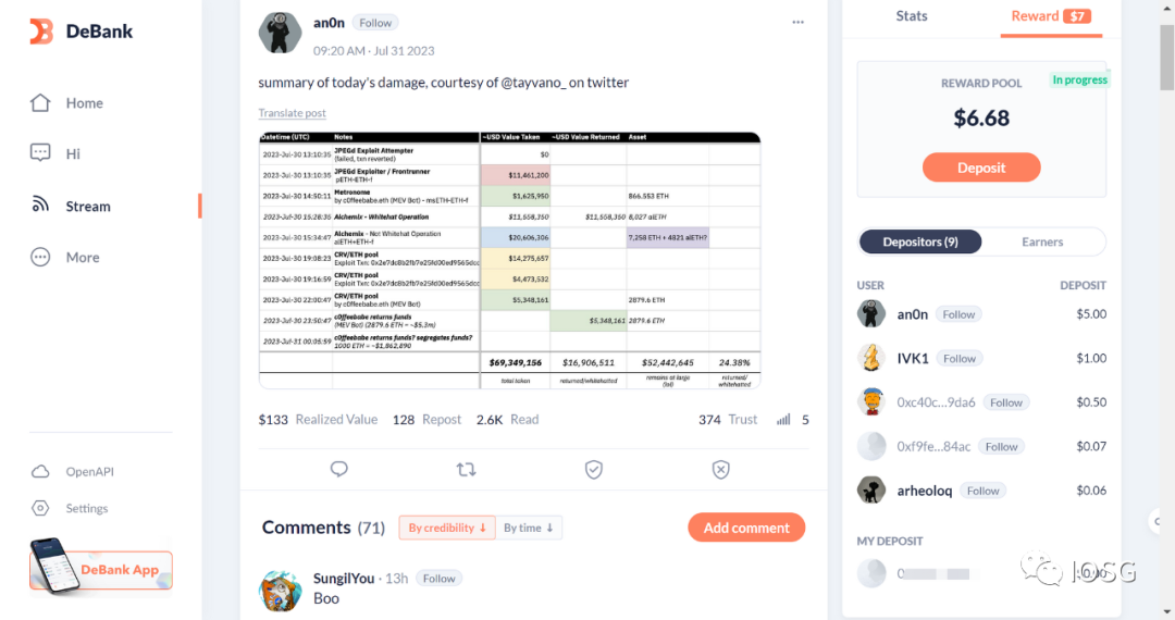 Debank的Stream功能是向socialfi发展的尝试的写照, 以钱包地址为账户可以提供更多的可验证信息, kol的观点更具有说服力, 有利于推动领域往更透明可信的方向发展. 用户也可对有价值的信息进行打赏, 是创作者经济一种理想的实现形式。