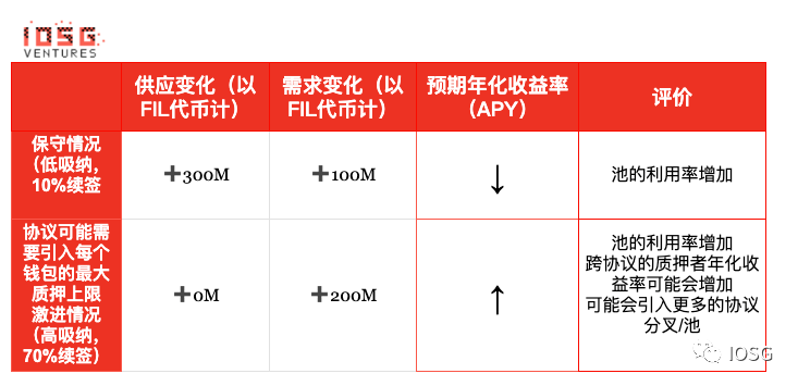 在供应方面,在保守的估计中,大约会产生3亿个 FIL 代币,而在更激进的情况下,流通供应量被模拟为与今天差不多相同。为什么会这样?因为如果有更多的交易被吸纳和续签,将会有更多的 FIL 代币被锁定在存储区块的质押中。