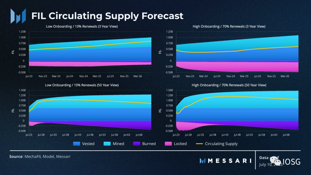 Messari 的专业人士使用不同的情况对 FIL 流通供应进行了3年和50年的预测模拟。