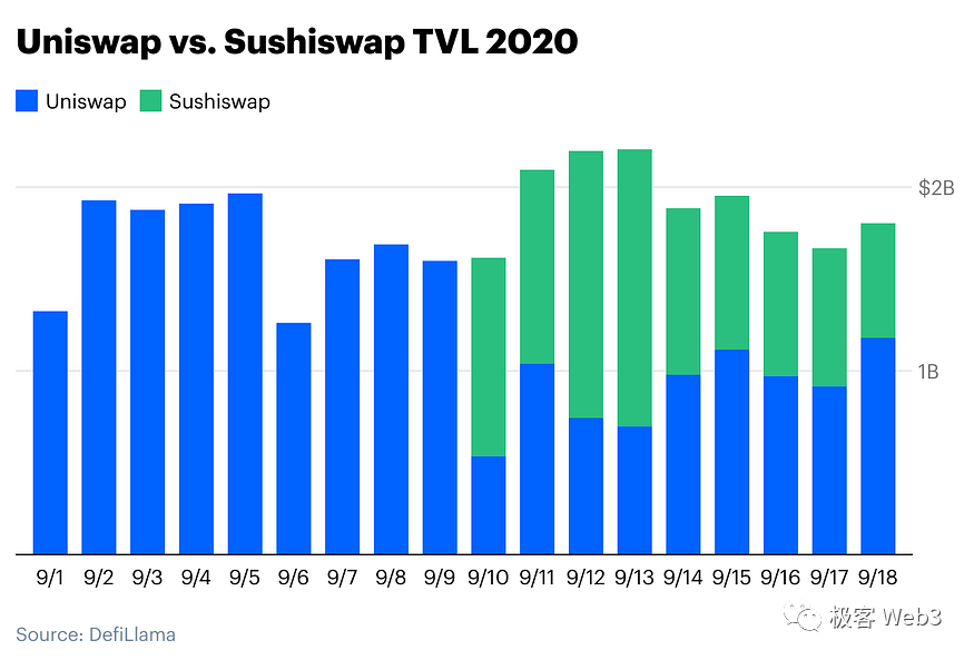 (2020年Sushi发起吸血鬼攻击,抢占了来自Uniswap的市场份额)