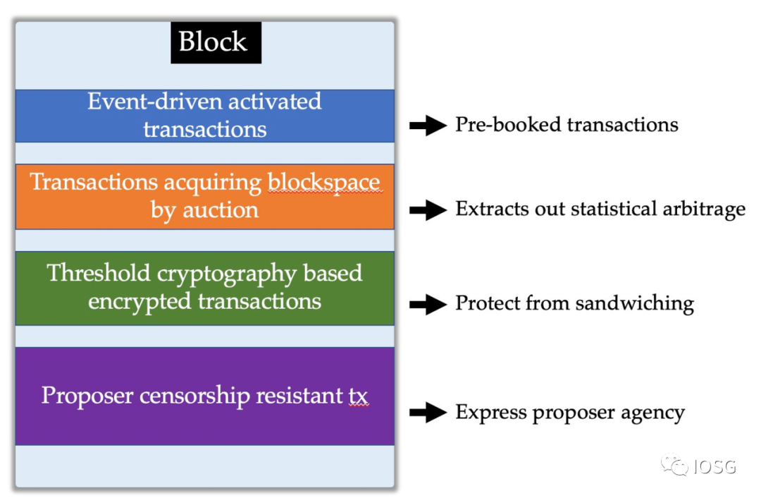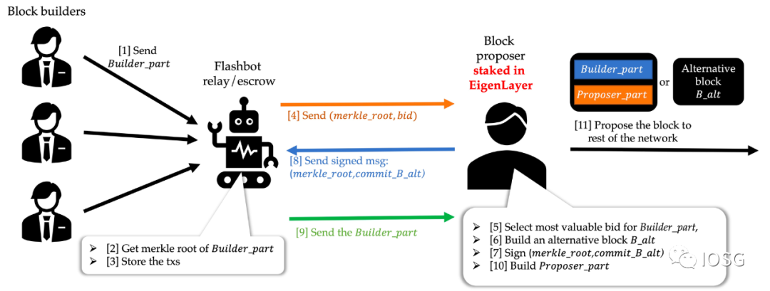 在当前 MEV-Boost 的设计中,提议者把区块空间完全外包给构建者,只能被动接收并提议构建者提交的整个区块。相较于分布更加广泛的提议者而言,构建者只有极少数,他们可能串通起来,对特定交易进行审查和勒索——因为提议者无法在 MEV-Boost 中包含自己想要的交易。EigenLayer 提出了 MEV-Boost++ 对 MEV-Boost 进行升级,在区块中引入了 Proposer-part,提议者可以在 Proposer-part 中包含任意交易。提议者也可以同时构建一个替代区块 B-alt,在中继没有释放 Builder_part 的情况下提议这个替代区块 B-alt。这种灵活性既确保了抗审查,又同时解决了中继的活跃性问题。