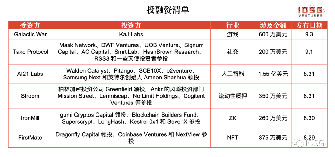 IOSG Ventures一直以来都在努力协助加密协议的发展和创新,这些协议具有改变加密货币领域格局的潜力。IOSG投资组合包括各种创新和高潜力的项目,其中包括ZKRU(Scroll,Starkware,Arbitrum,zkSync)、安全审计(Runtime Verification,Hexens)、MEV(Flashbots,Blocknative)、DeFi/NFT-Fi(1inch,Metamask)、FOG(Playmint,Bigtime,Illuvium)以及一些行业龙头,如Risc0,Cosmos,Celestia,Eigenlayer,Scroll,zkSync,Nil Foundation和Mina等等。
