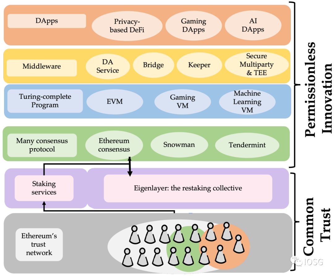 这样做的好处是:其一,项目方不需要自己引导新的信任网络,而是外包给以太坊验证者,尽可能地降低了资金成本;其二,以太坊验证者集合的经济安全非常牢固,使安全性也得到了一定的保证。从以太坊质押者的角度看,再质押为他们提供了额外收益,只要没有主观作恶意图,整体风险可控。
