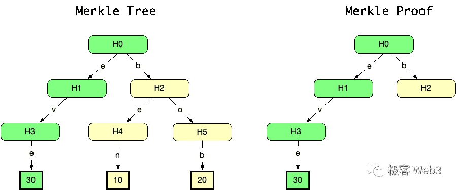 如果要证明某笔交易H3的确包含在Merkle Tree中,设法证明用H3和Merkle Tree上其他的部分数据,可以生成Root,而生成Root所需要的那部分数据(包括Td在内)就构成了Merkle Proof。