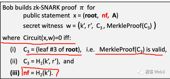 而Bob在取款时,要证明自己拥有的凭证对应着Merkle Tree上有记录的某笔存款哈希Cn。也就是说,他要证明两件事: