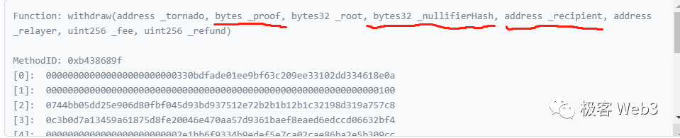 这一步就相当于证明:我知道某笔记录于Merkle Tree上的存款记录对应的密钥。当ZK Proof被提交给Tornado合约时,上述4个参数均被隐藏,外界(包括Tornado合约)无法获知,借此保障了隐私。