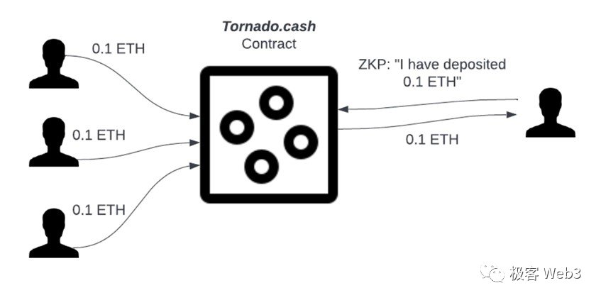Tornado的主要思路是:把大量的存取款行为混杂在一起,存款者在Tornado存入Token后,出示ZK Proof证明自己存过款,再用一个新地址提款,以此切断存取款地址之间的关联性。