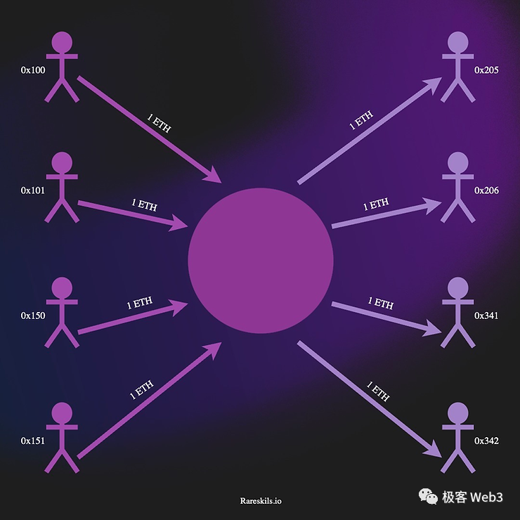 这种场景似乎屡见不鲜:当我们从Uniswap池子里SWAP几枚ETH时,根本无法知道划走的ETH是谁提供的,因为曾给Uniswap提供流动性的人太多了。但不同之处是,每次用Uniswap划走Token,我们需要用其他Token作为等价的成本,且不能把资金“私密的”转让给别人;而混币器只需要提款者出示存款凭证就行。