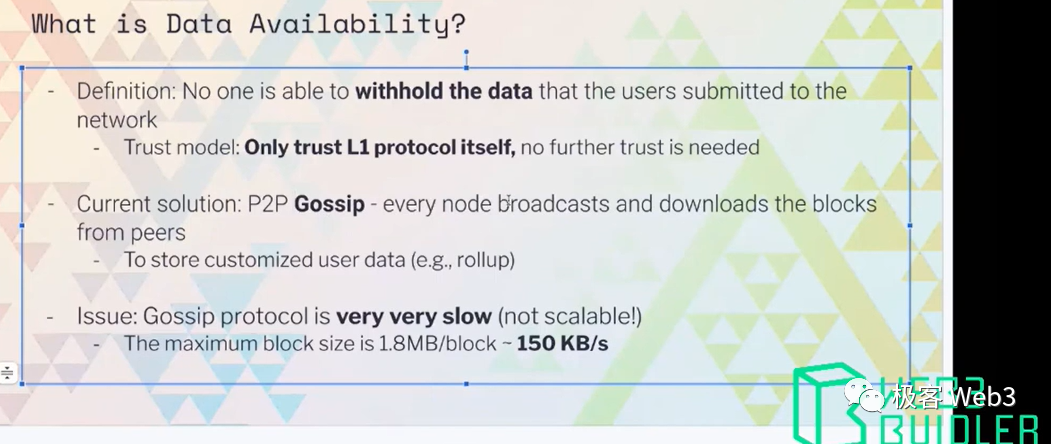 而在以太坊官网,有关于DA的如下概括:可以把数据可用性难题概括为一个问题:“我们如何验证一个新区块的数据是否可用?”......对于轻客户端来说,数据可用性问题是指在无需下载整个区块的情况下,验证区块的可用性。