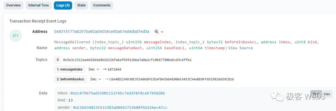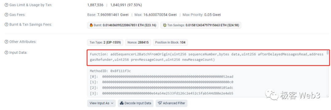 (Arbitrum排序器向以太坊上某合约post的交易批次,合约本身不验证这些数据,只抛出一个事件让L2全节点来监听,让后者知道排序器发布了交易批次)