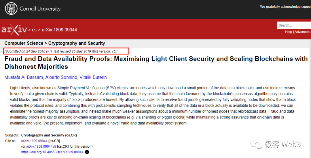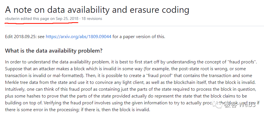 但显然,DA概念不是那么好解释的,因为Vitalik的这篇github文档前前后后进行了18次更正。记录显示,最后一次更正提交于2018.9.25。而就在前一天的2018.9.24,Celestia创始人Mustafa与Vitalik联名发表了日后声名大噪的论文——Fraud and Data Availability Proofs: Maximising Light Client Security and Scaling Blockchains with Dishonest Majorities.