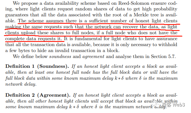 按照vitalik和mustafa的说法,他们其实是把此前就有人提出的想法结合了起来,并在此之上做出了一定的创新。而从整个构思的出发点与实现方式来看,显然所谓的“数据可用性”指的是验证最新block所需的那些数据,是否都有被区块提议者发布出去,且能不能被验证者们接收到。这关乎“数据是否完整发布”而不是“历史数据是否可以被检索到”。