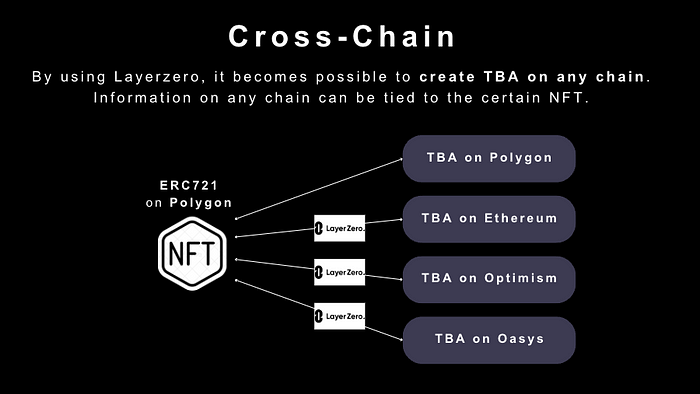 正如 EIP 的“跨链兼容性”中提到的,在配置代币绑定账户(TBA)时,可以将“链 ID”设为来自不同链的 NFT 对应的值。此外,为 TBA 生成的地址在所有链中保持一致。要实际利用跨多个链部署的 TBA,用户需要验证他们在指定链上持有特定的 NFT,这就需要使用 Layerzero、chainlink-ccip 或 Lit 等跨链通信工具。