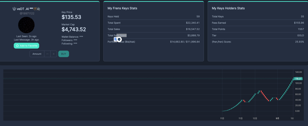 realfriend.tech:由 @iam4x 制作的网页版 friend.tech 前端,提供各种交易数据包括线图、PNL、实时交易数据以及新用户看板,此外还有狙击新用户的机器人以及聊天室等功能,功能比 friendmex 更多些但缺点是需要购买创办人的 Key 通过验证才能使用。