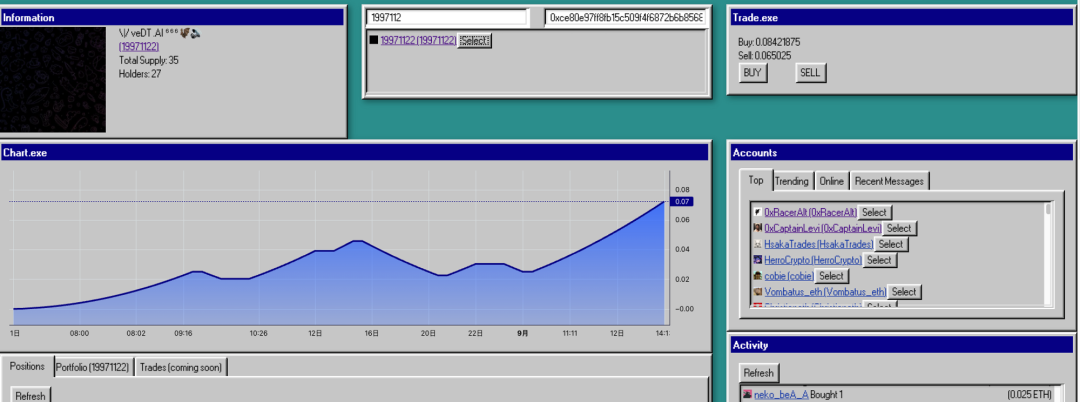 frentech95.com:由 @0xsubmerged 制作,与前两者一样有付费门槛需购买创办人的 Key,Windows 95 复古风格的交易前端,具备交易看线图与聊天室等等基本功能,功能较阳春但界面简洁。