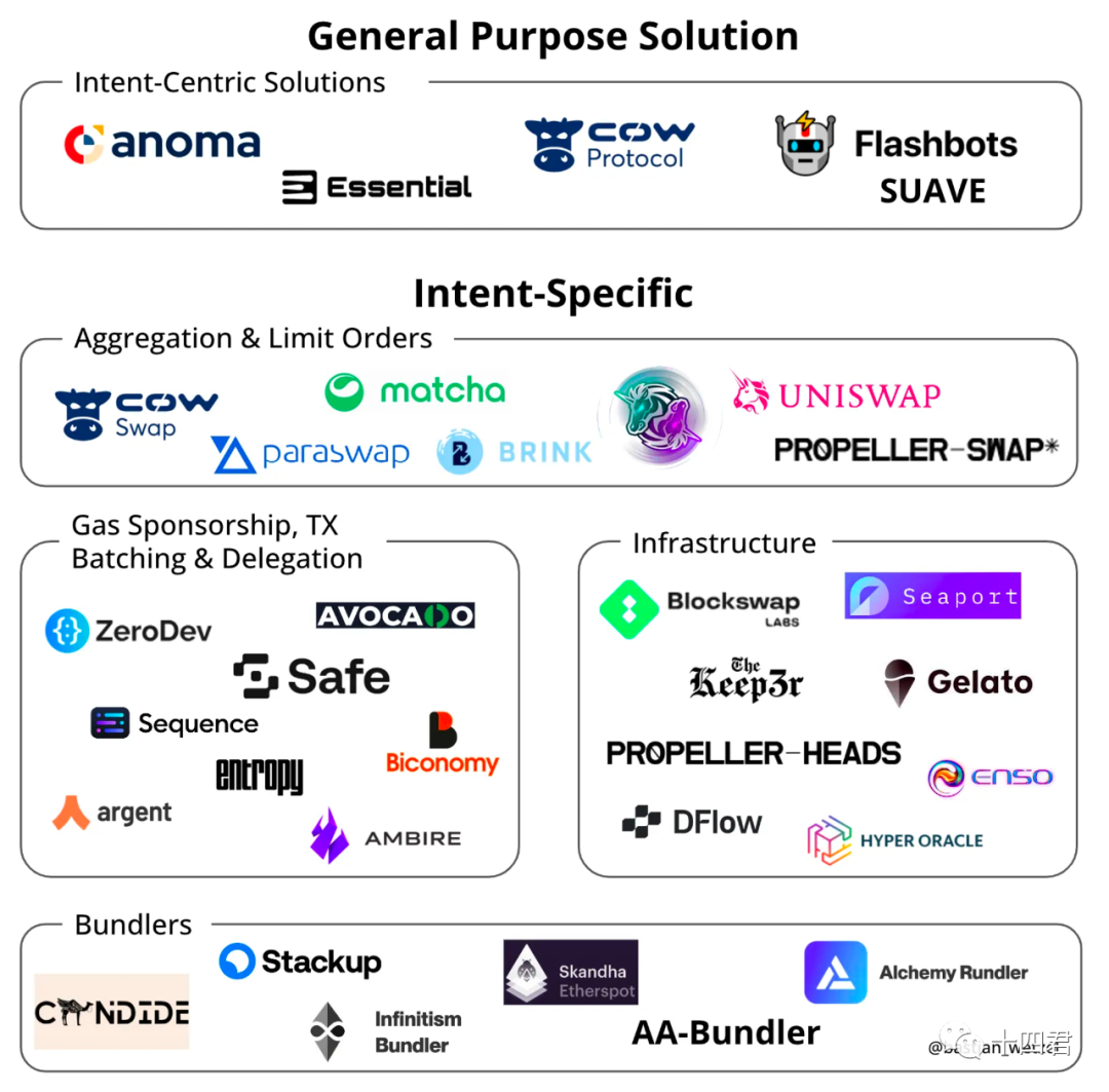 尽管以意图为中心的概念刚刚被提出,但涉及的项目数量已不再少数,或者说很多落地中的项目本身的立意也是以用户意图为中心。在Bastian Wetzel 的这篇文章中<Intent-Based Architectures and Projects Experimenting with Them> ,亦归类了各种主流项目。下图中可以看出,很多协议其实并非属于通用意图解决方案,而是特定意图解决方案,比如uniswap、Seaport,这点对比web2做得好垂类解决方案也是意图为中心的必经发展之路。