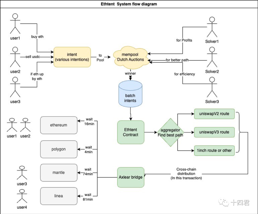 在本次Token2049的黑客松比赛里,笔者参与的亦是从DeFi赛道,解决了一个跨链Swap+策略辅助定投场景的Intent solver(Ethtent系统运作如下图)。